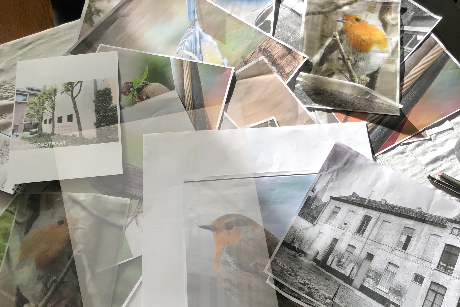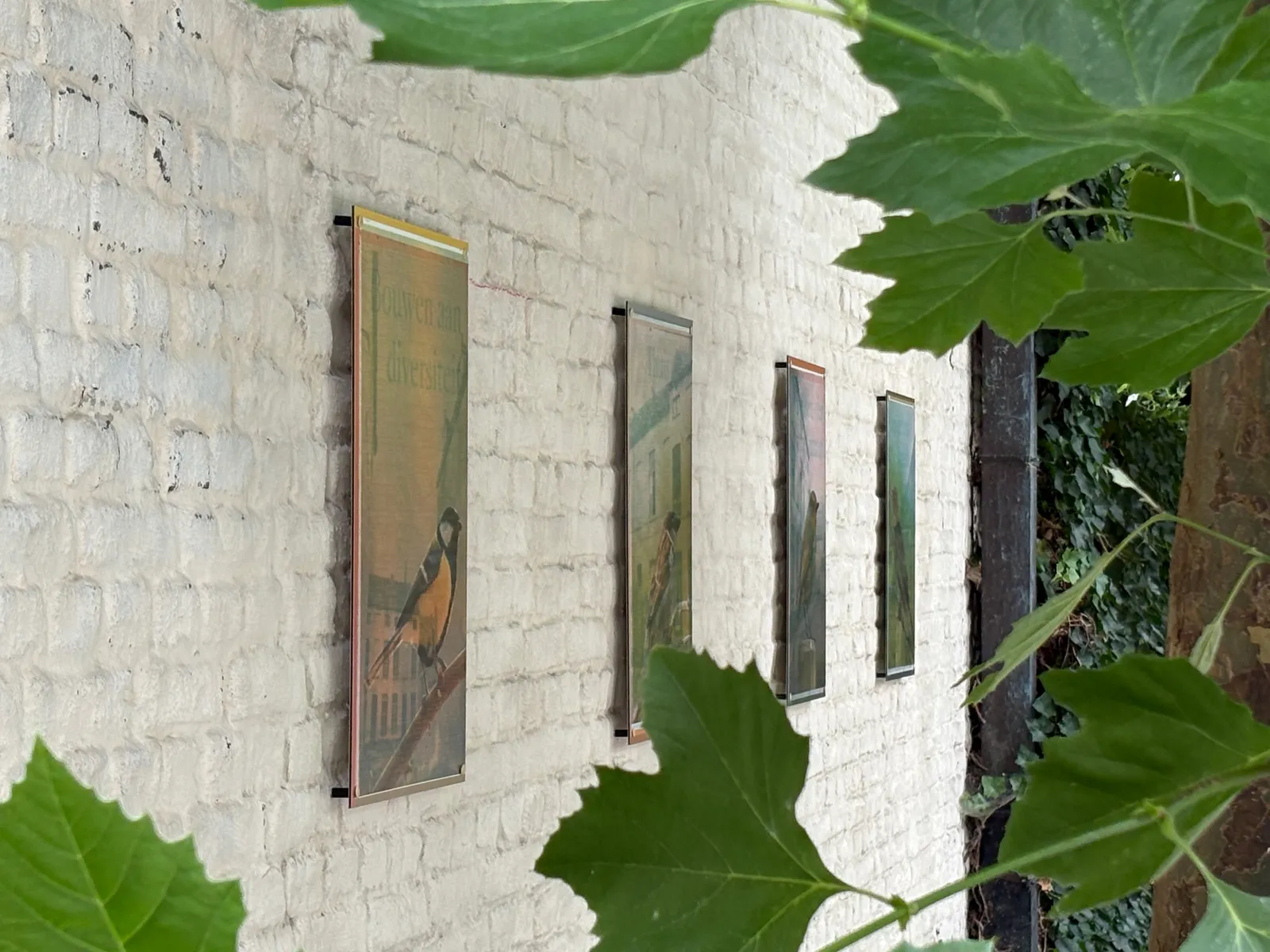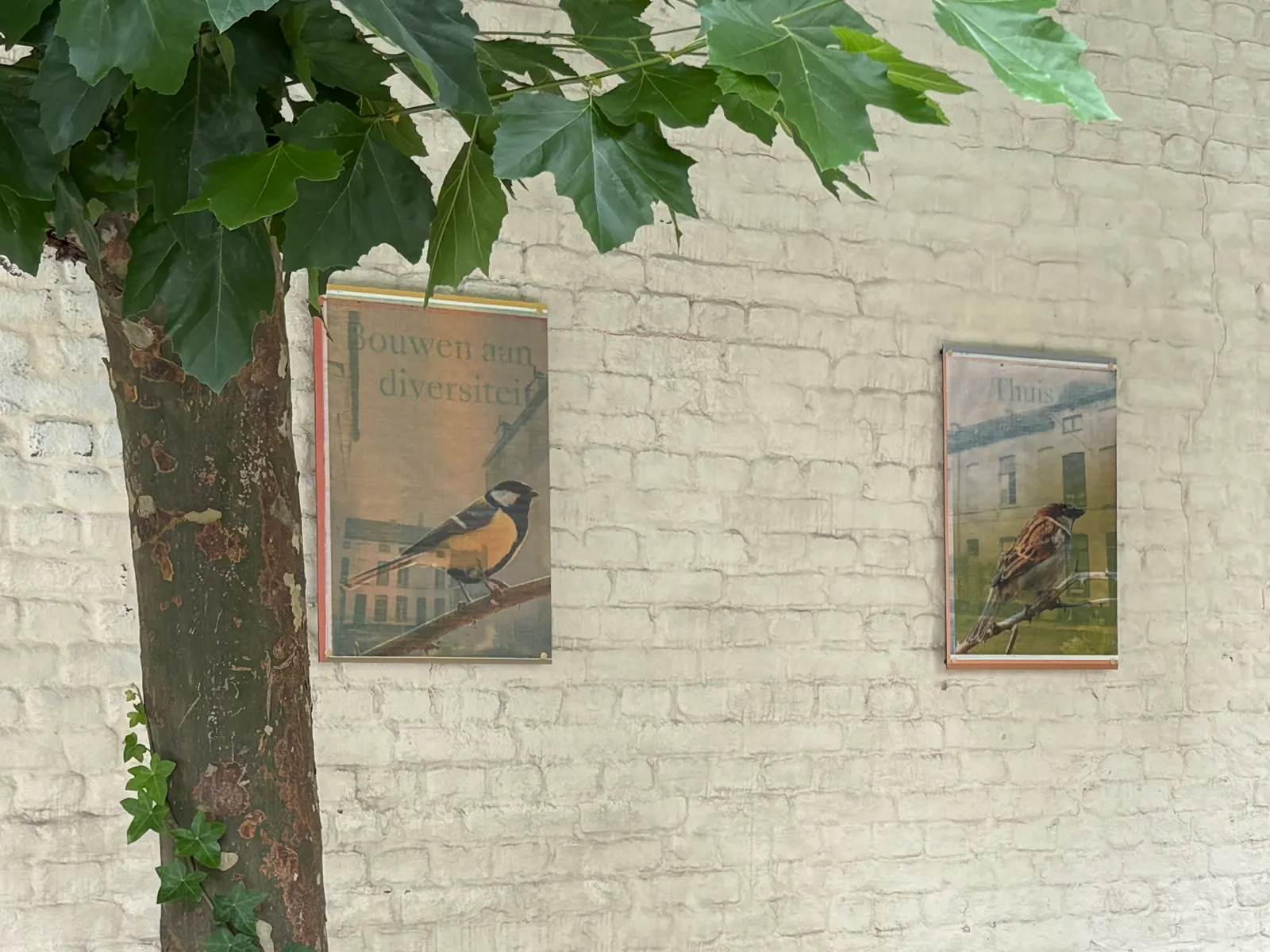 Rustig zittend kijken de vogels de cité in. Door plaatsing van de merel/huismus in omgekeerde richting ontstaat er interactie. Gezamenlijk vormen ze een geheel met hun groene omgeving. Zodra je het werk van dichtbij bekijkt, valt op dat de achtergronden van de vier panelen worden gevormd door oude foto’s van de cité, dragers van tijd en van herinneringen van mensen van vroeger en nu. Hoewel er intussen veel is veranderd, zijn de huisjes nog goed herkenbaar.