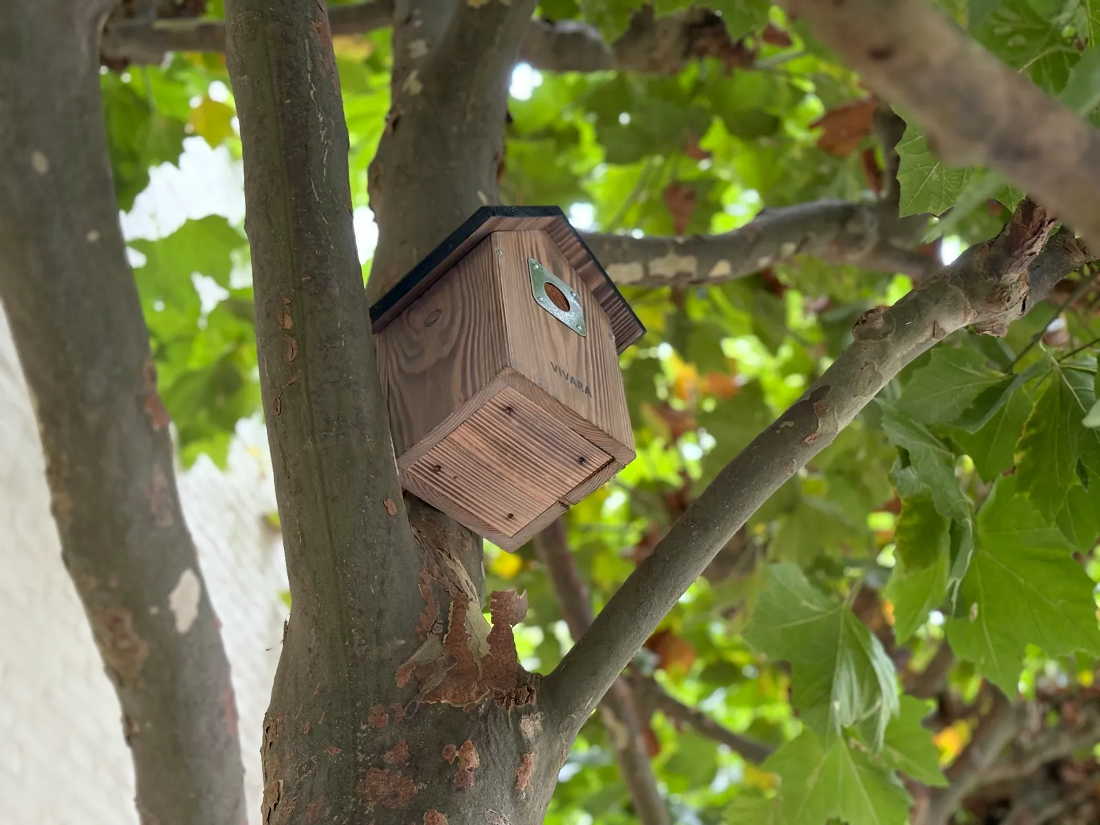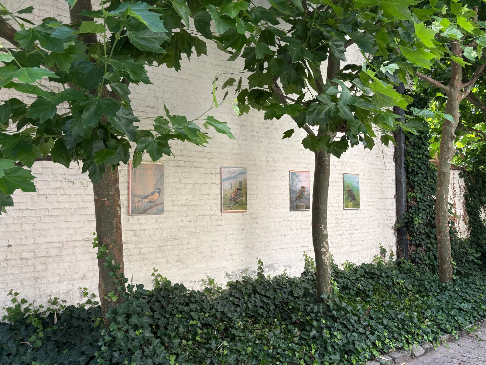 Hier in de bomenrij langs de zijgevel hangen nestkastjes en daaronder hun mogelijke bewoners: de huismus, het roodborstje, de merel en de koolmees. Het zijn de vogels die de bewoners hier het meest hebben gespot.