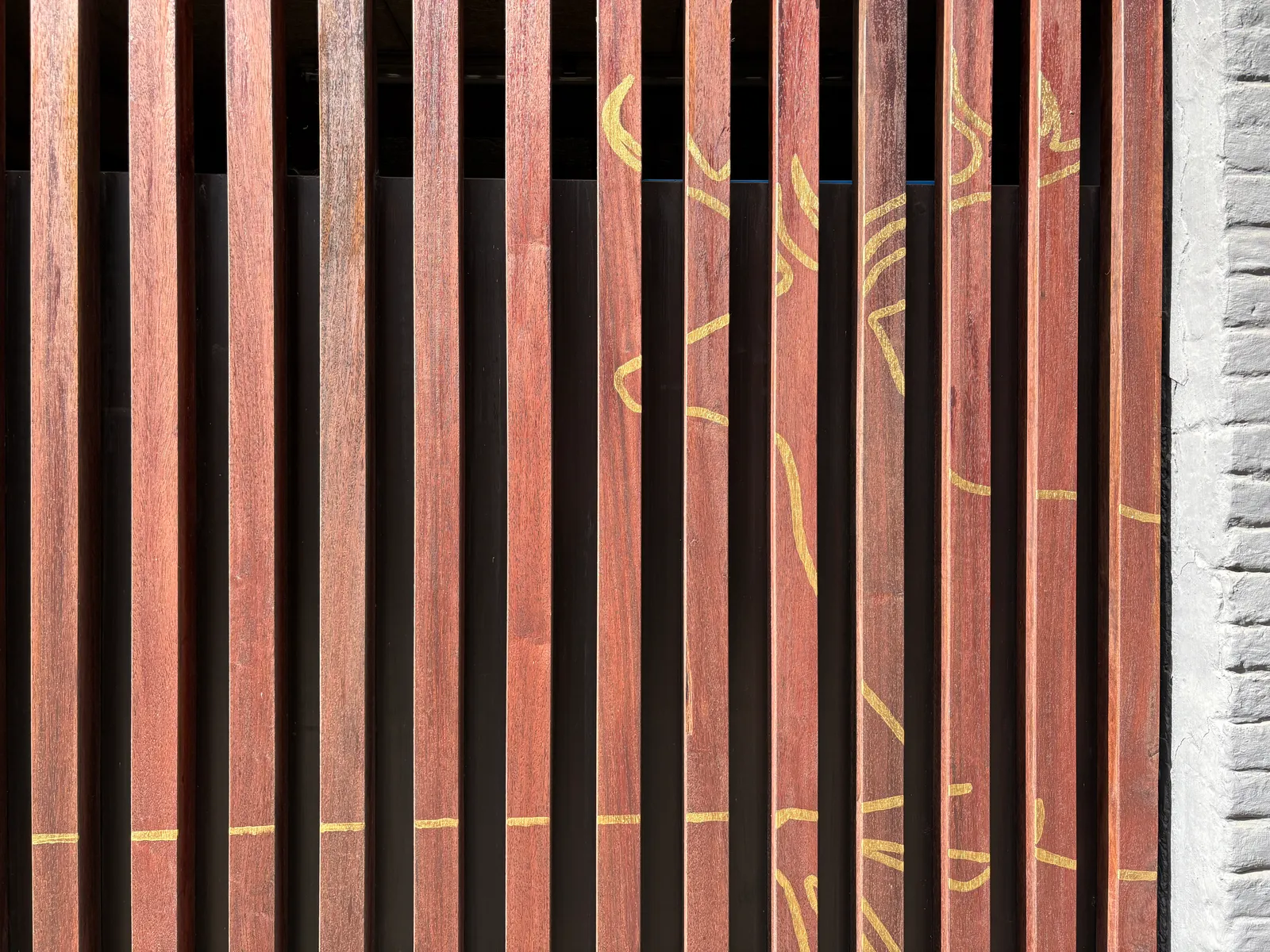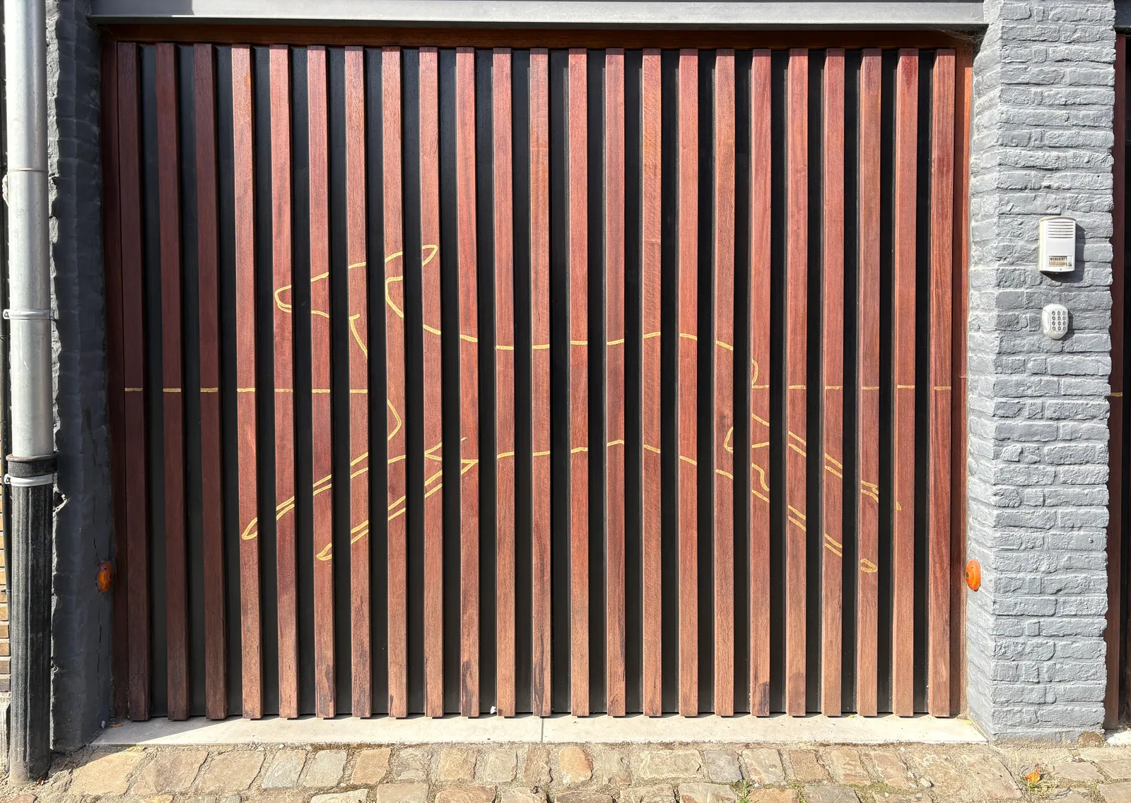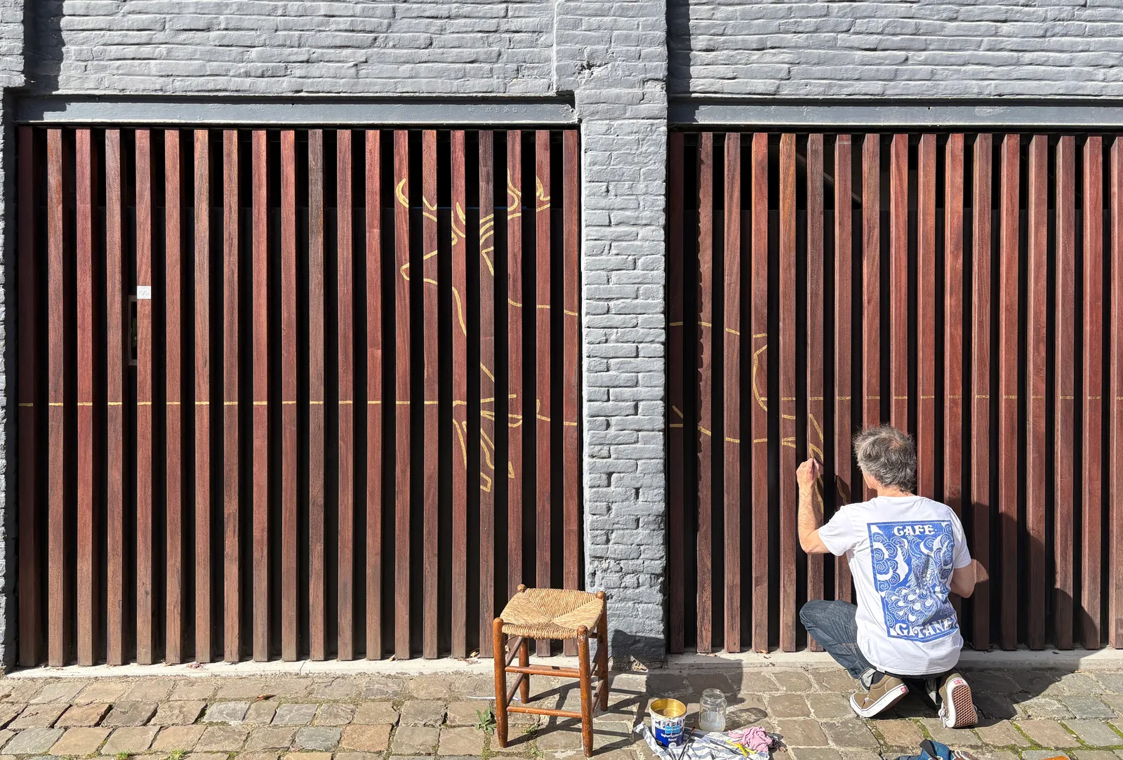 Schilderwerk met herten, in goudverf op de poorten van de voormalige smidse aan de Hertstraat 22. Vandaag is in het gebouw de co-working space ‘Werkhert’ gevestigd.