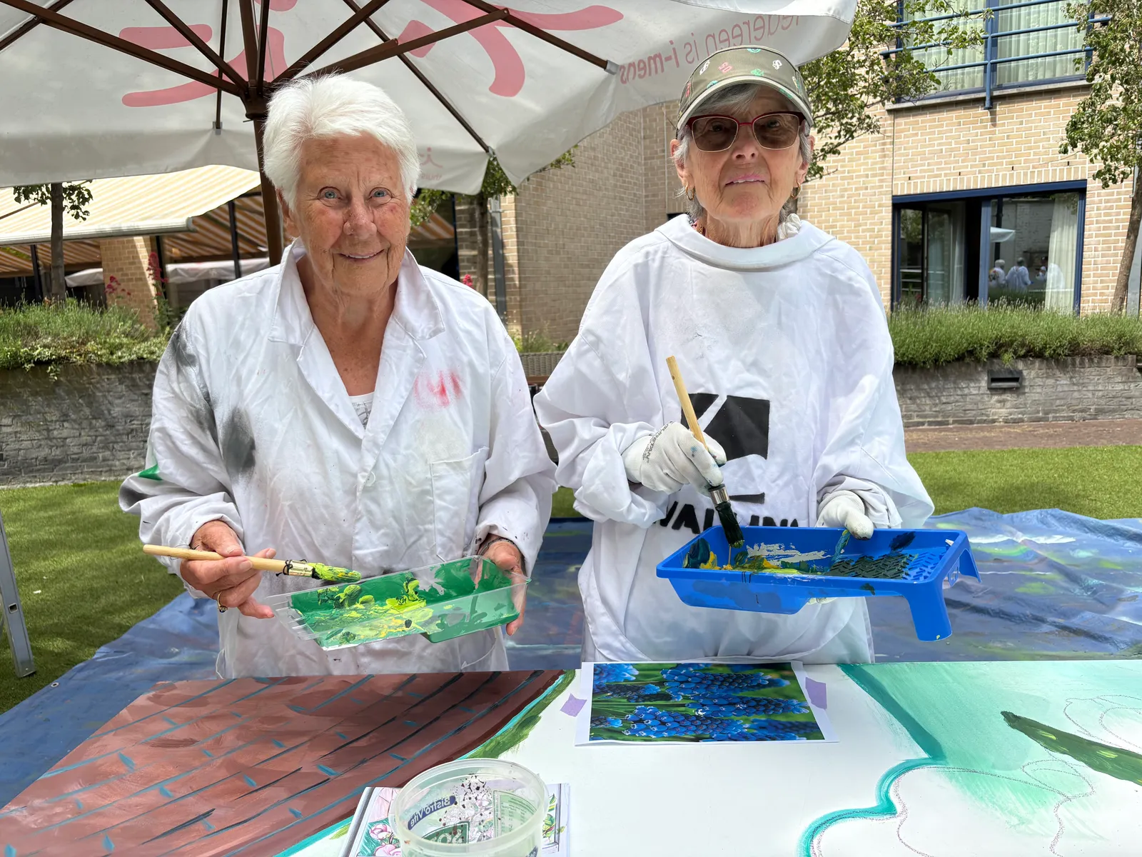 Deze twee panelen zijn het resultaat van een workshop schilderen op een mooie dag in mei, met bewoners en personeel van het Senior City Woonzorgcentrum.