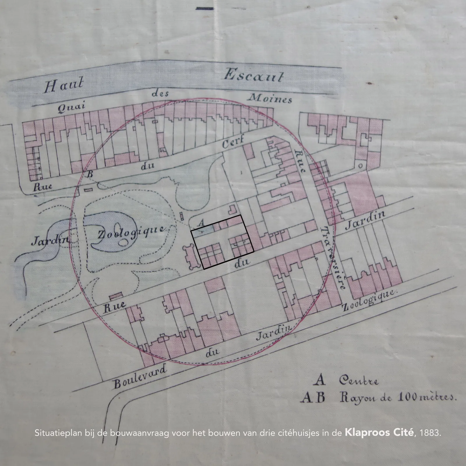 Als je de code aan de Hofstraat 44 scant, dan sta je voor ons huis. Dat is één van de zes ‘voorhuizen’ van de cité. Het plan op het bord is het situatieplan bij de bouwaanvraag van 1883 voor het bouwen van drie citéhuisjes achteraan links op het perceel. De hele site (bereikbaar vanaf de ‘Rue du Jardin’) was in die tijd eigendom van bouwkundige (en ontwikkelaar) Frans Cardon-Note. Ze was gelegen vlak naast de ‘Gentsche Diergaerde’ die hier bestond tussen 1851 en 1905.