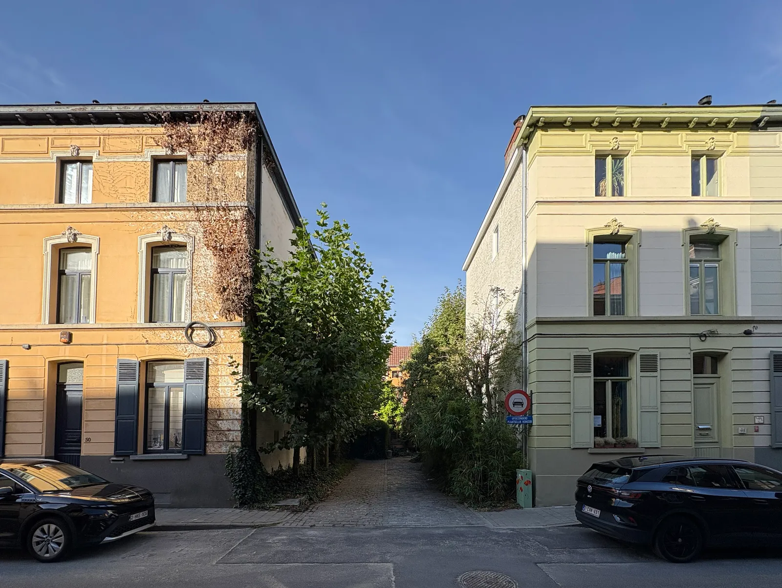 Steek nu de straat over en wandel tot net voor de ingang van de Klaproosstraat, om de neoclassicistische gevelrij van de voorhuizen te aanschouwen. Dit beeldbepalend ensemble van zes identieke stadswoningen werd gebouwd rond 1872-1875, met de Klaproosstraat als spiegel-as. Steek nu terug over en wandel door de Klaproosstraat. Geniet onderweg van de kunst van Angelica Overwater (nutskastje rechts, en project ‘Nestas’ links) en van Francis Bekemans (poort rechts).