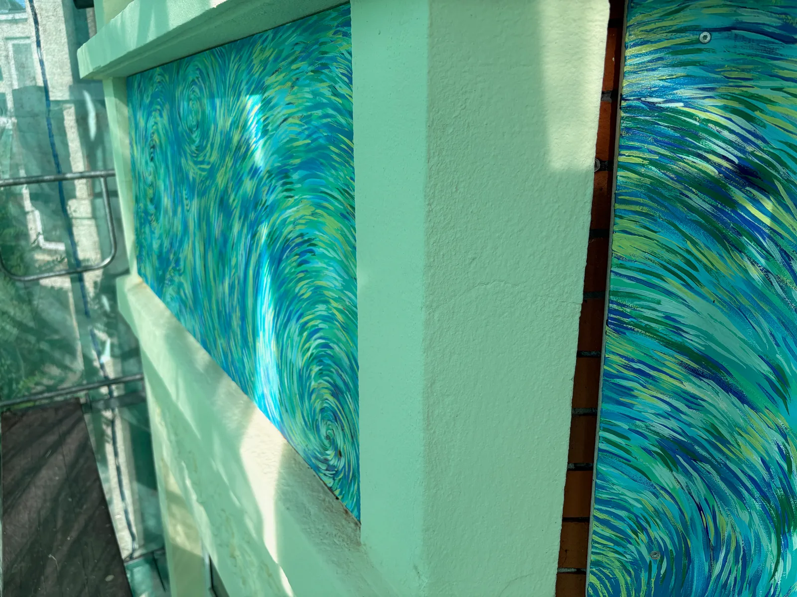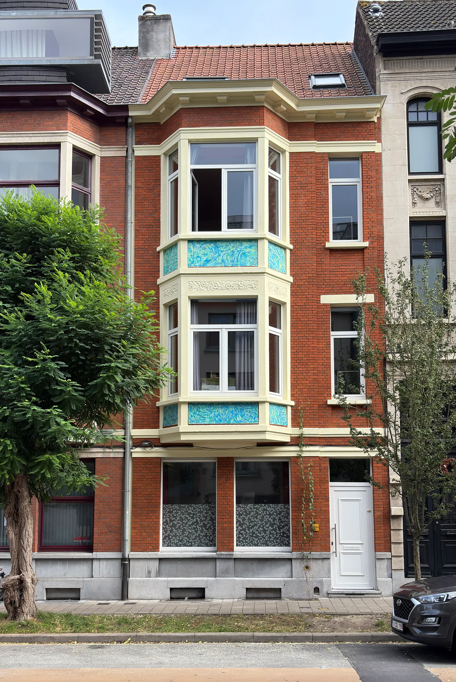 Het huis van Alex, ondergedompeld in krullende lijnen, organische vormen, de lievelingskleuren van Ray. Een ‘tableau’ - zoals je er meer vindt op gevels in en rond de Tentoonstellingslaan - maar dan van 100 of meer jaren later.