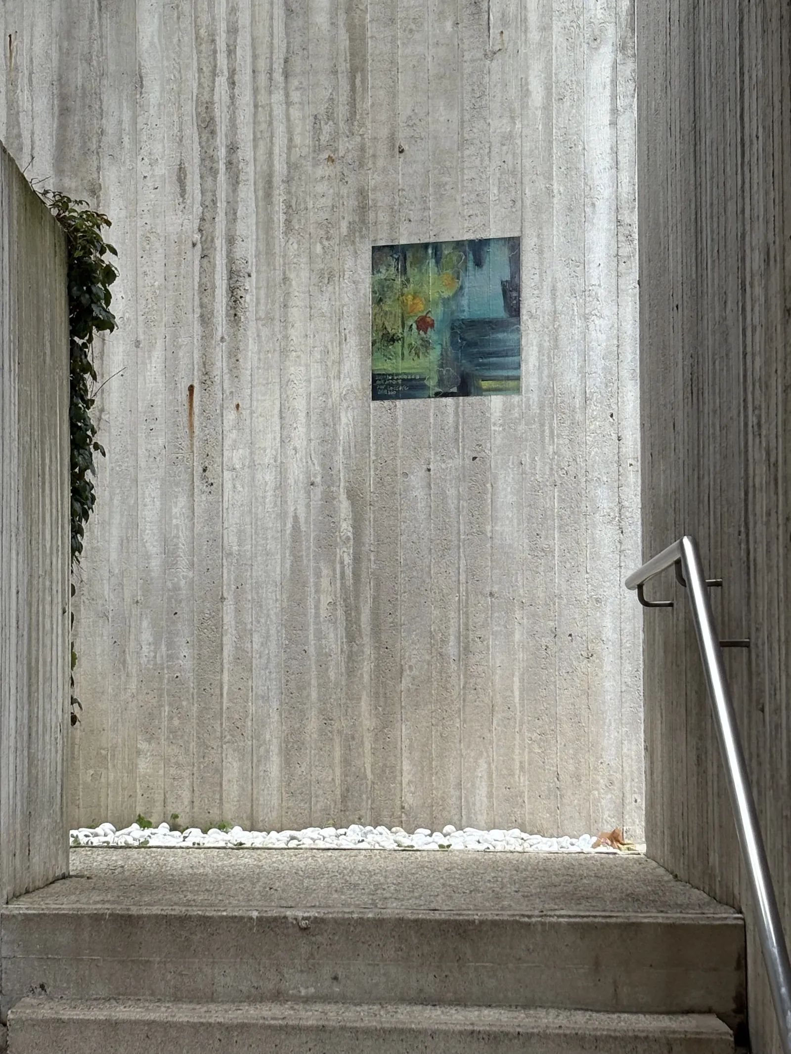 De plaats van het werk is gedurfd: het gaat hier over de ruw bekiste betonnen muren van hét architecturele monument in onze wijk: de voormalige doktersprakijk van dokter Jacques Coupez, gebouwd in 1972 in brutalistische stijl, naar een ontwerp van Ivan Van Mossevelde (die ondertussen ook al vele jaren in Italië woont).