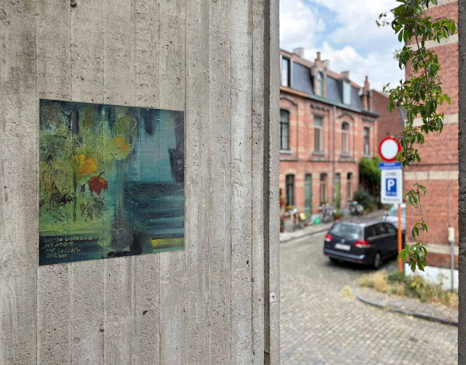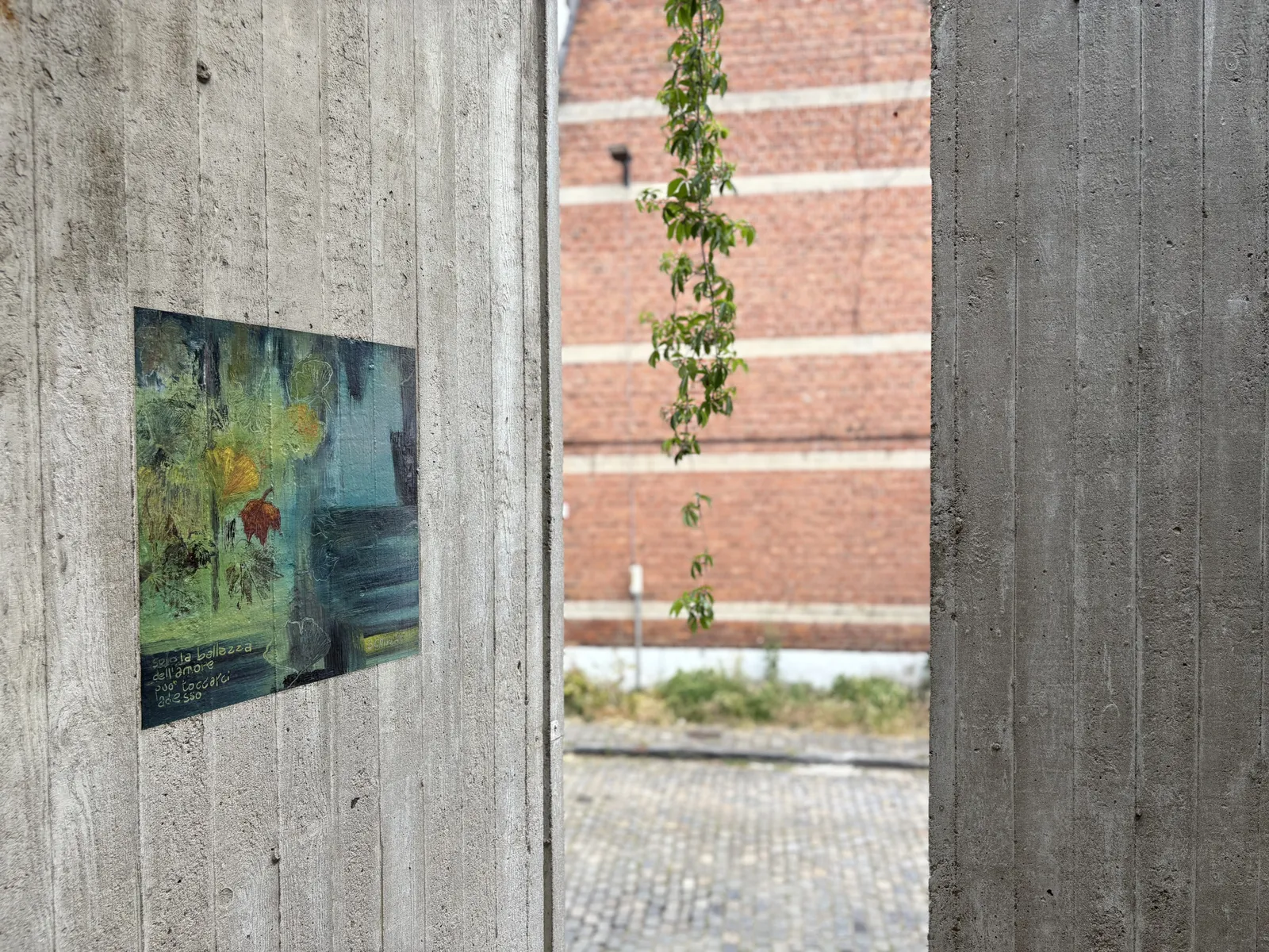 Het was architect Tom Coupez die op de eerste ‘Kunst in de wijk’ avond in mei 2024 met het idee kwam om het werk van Santina Chirulli (Cisternino Italië, maar al sinds 1998 in Gent en sinds 2003 bewoner van onze wijk) en dat van leraar en woordkunstenaar Johan De Vos samen te brengen.