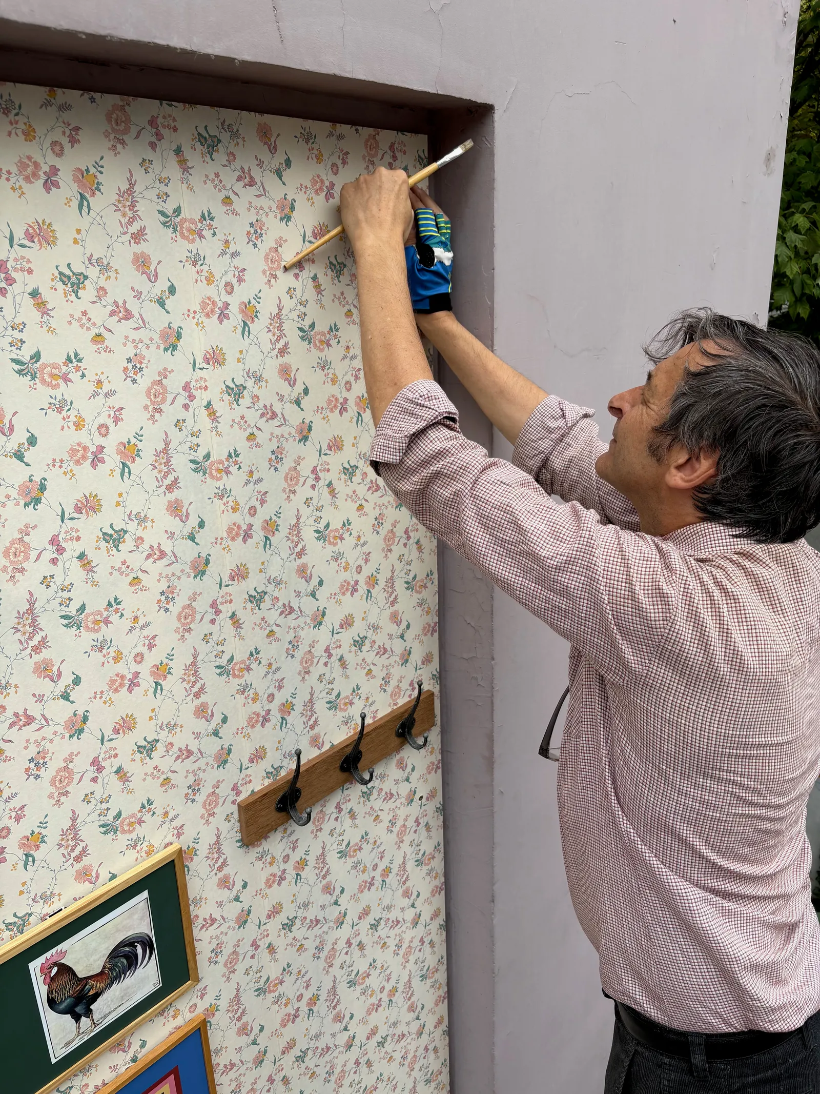 Bloemetjesbehang van bij Priem en een kapstok op reikhoogte. Een aquarel (© René Delin 1924) van een haan: elke dag wakker worden en er met zijn allen het beste van maken, een metafoor voor ons collectief verlangen naar een goed leven.