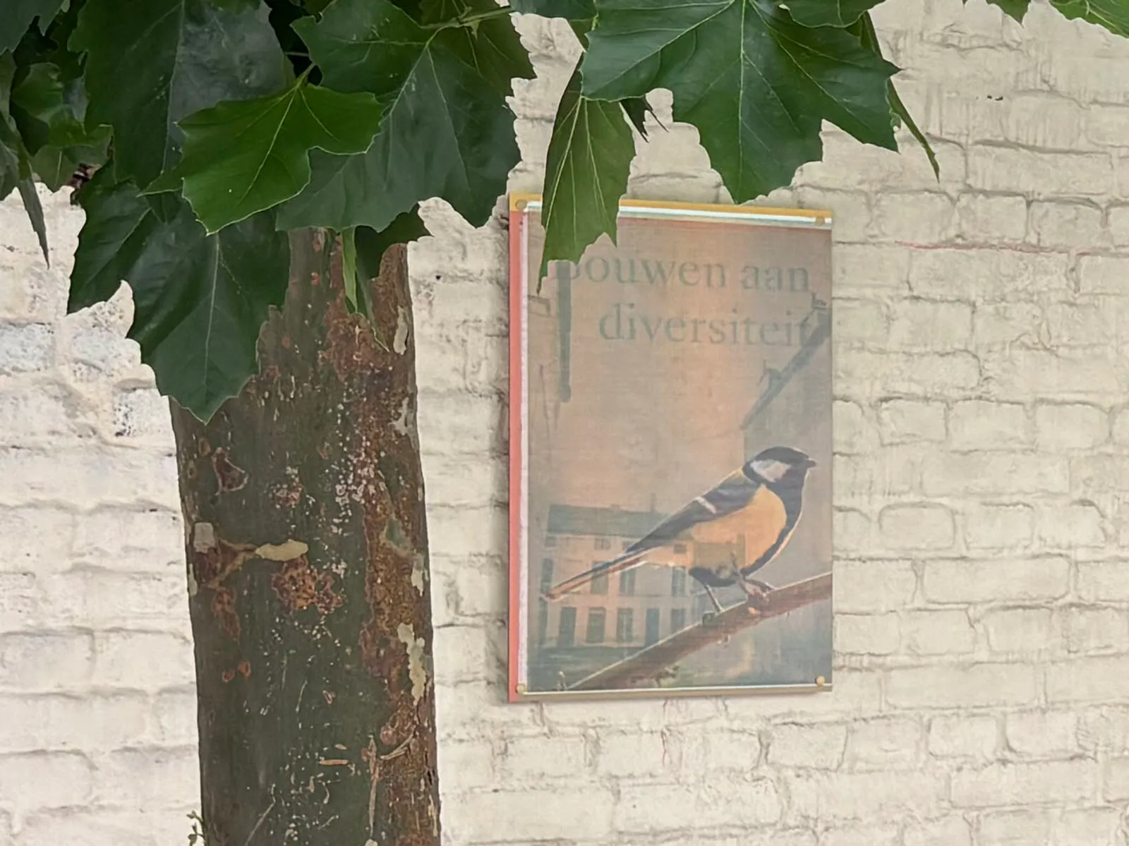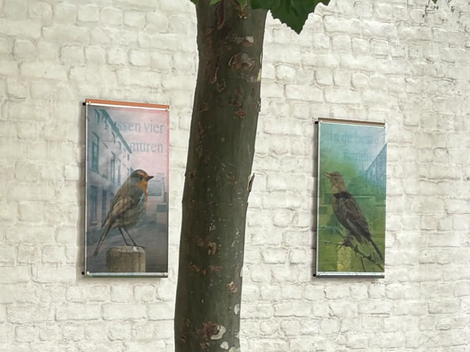 Rustig zittend kijken de vogels de cité in. Door plaatsing van de merel/huismus in omgekeerde richting ontstaat er interactie. Gezamenlijk vormen ze een geheel met hun groene omgeving. Zodra je het werk van dichtbij bekijkt, valt op dat de achtergronden van de vier panelen worden gevormd door oude foto’s van de cité, dragers van tijd en van herinneringen van mensen van vroeger en nu. Hoewel er intussen veel is veranderd, zijn de huisjes nog goed herkenbaar.