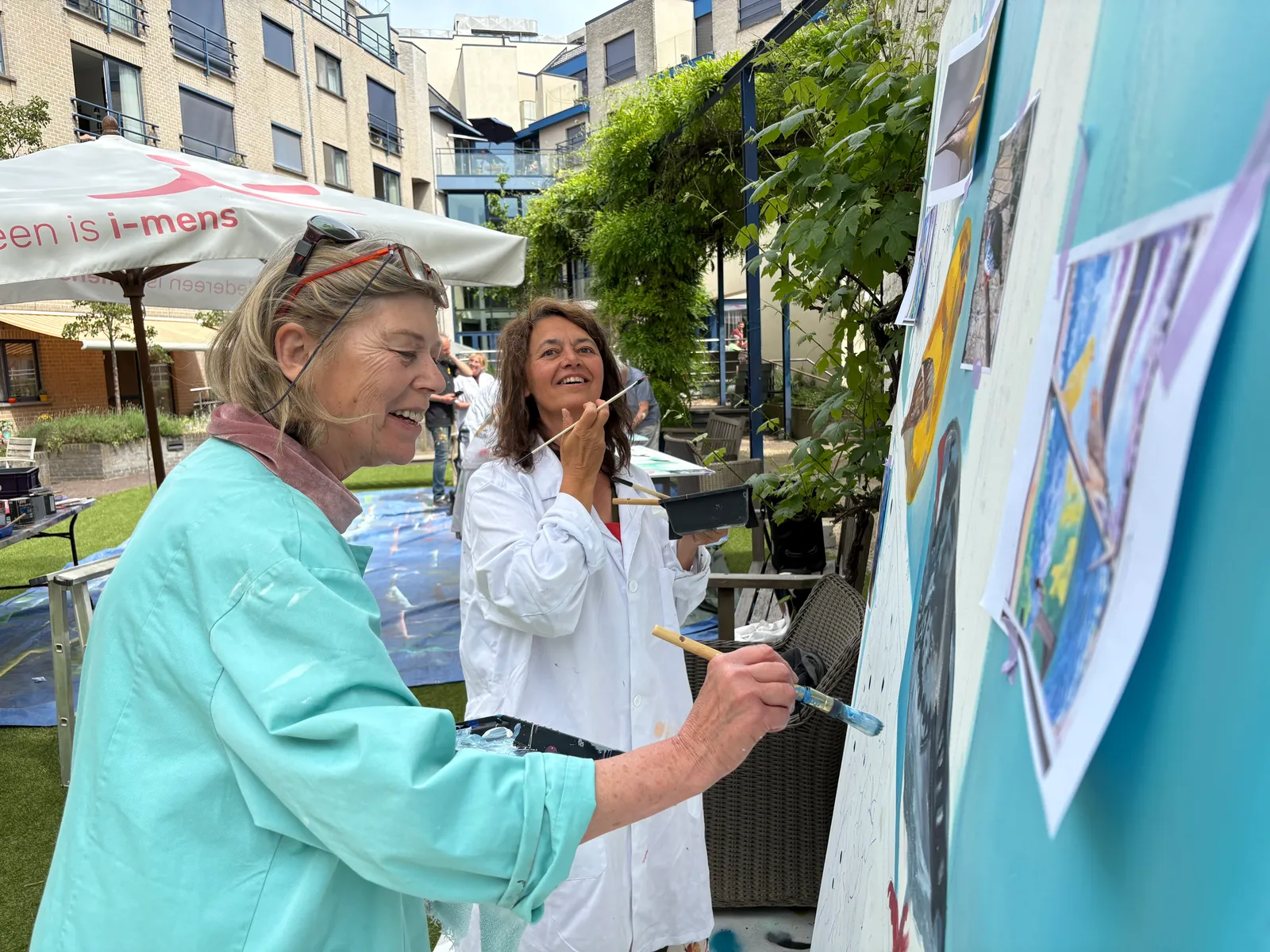Deze twee panelen zijn het resultaat van een workshop schilderen op een mooie dag in mei, met bewoners en personeel van het Senior City Woonzorgcentrum.