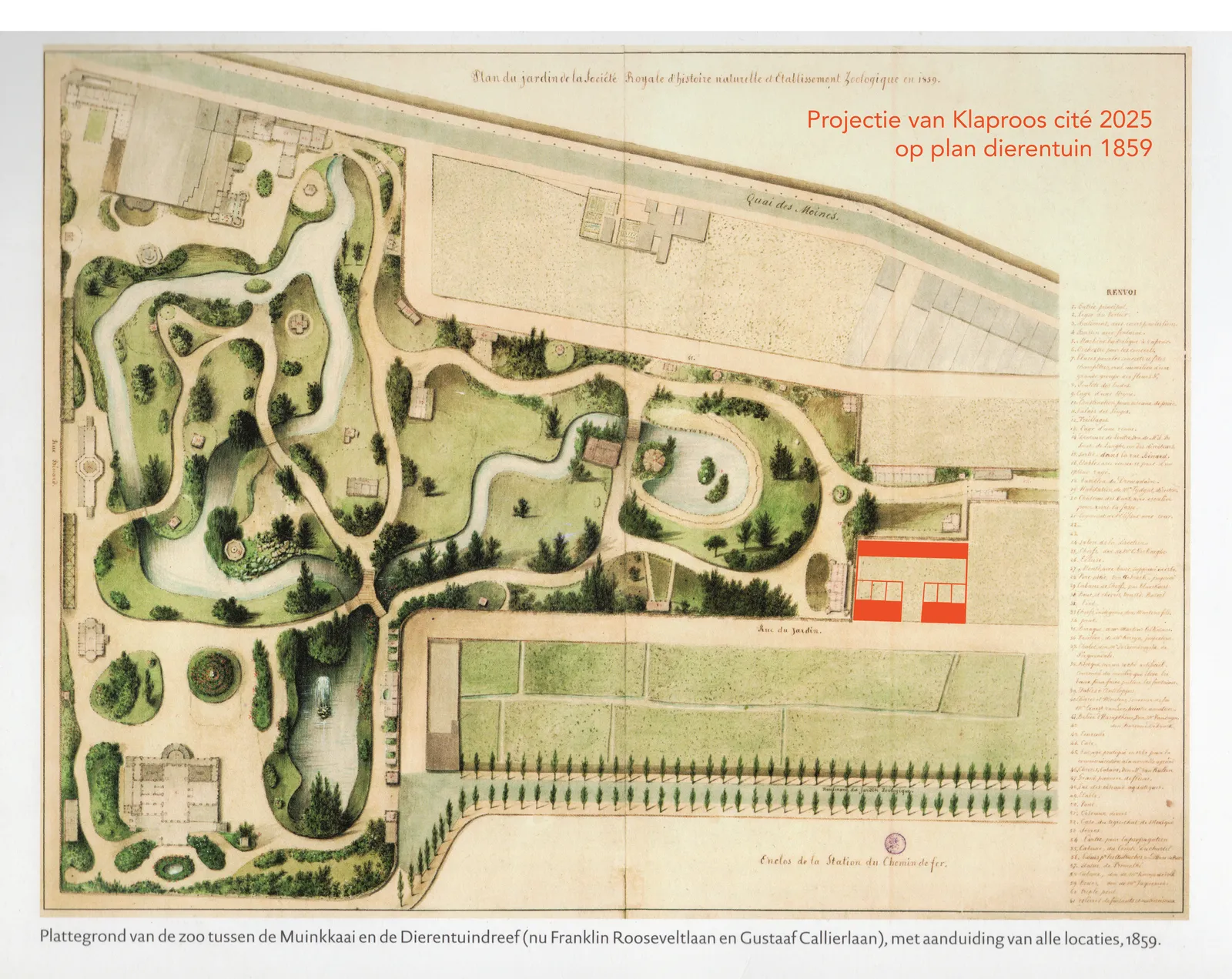 Als je de code aan de Hofstraat 44 scant, dan sta je voor ons huis. Dat is één van de zes ‘voorhuizen’ van de cité. Het plan op het bord is het situatieplan bij de bouwaanvraag van 1883 voor het bouwen van drie citéhuisjes achteraan links op het perceel. De hele site (bereikbaar vanaf de ‘Rue du Jardin’) was in die tijd eigendom van bouwkundige (en ontwikkelaar) Frans Cardon-Note. Ze was gelegen vlak naast de ‘Gentsche Diergaerde’ die hier bestond tussen 1851 en 1905.
