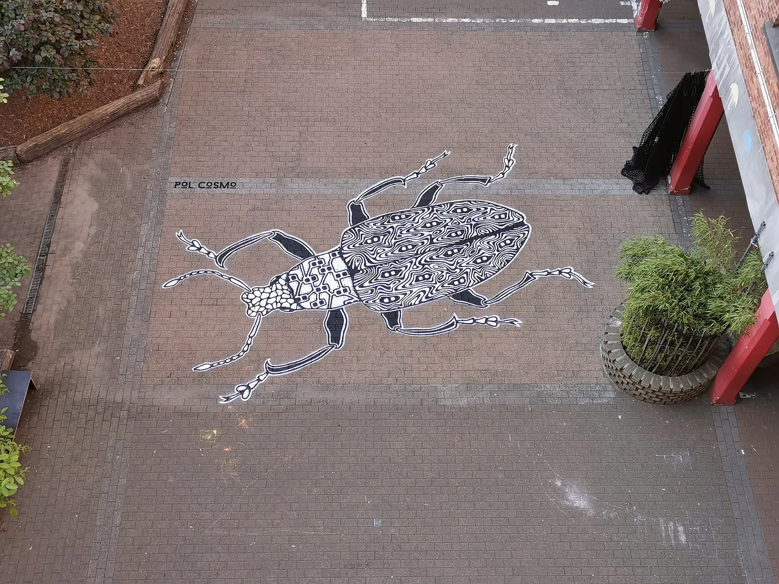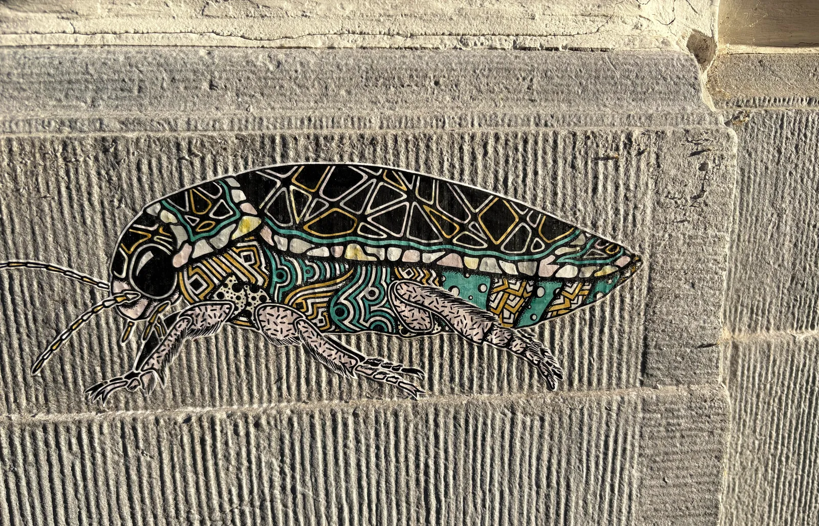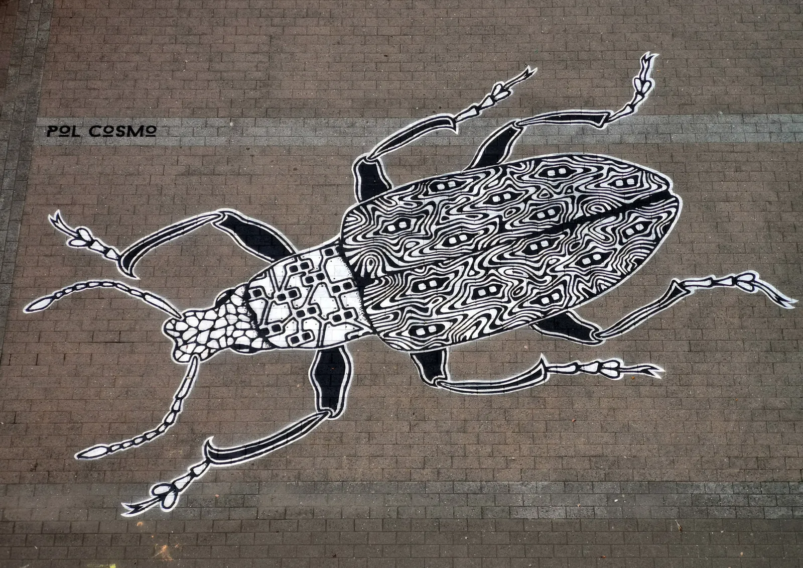Pol Cosmo is een Gentse straatkunstenaar. Al jaren tekent en kleurt hij (liefst in de luwte) kleine insecten en plakt ze overal in de stad.