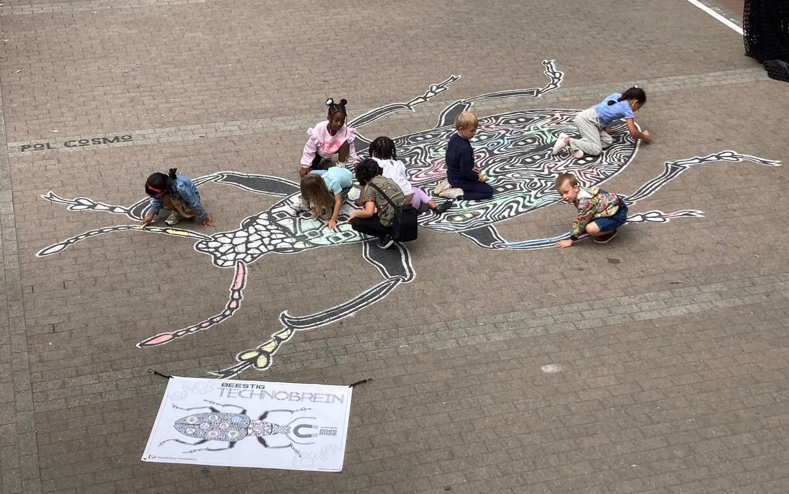 Het dekschild van de kever worden kleine ‘techniekschildjes’. Het kunstwerk krijgt een volledig schooljaar een centrale plaats op de school.