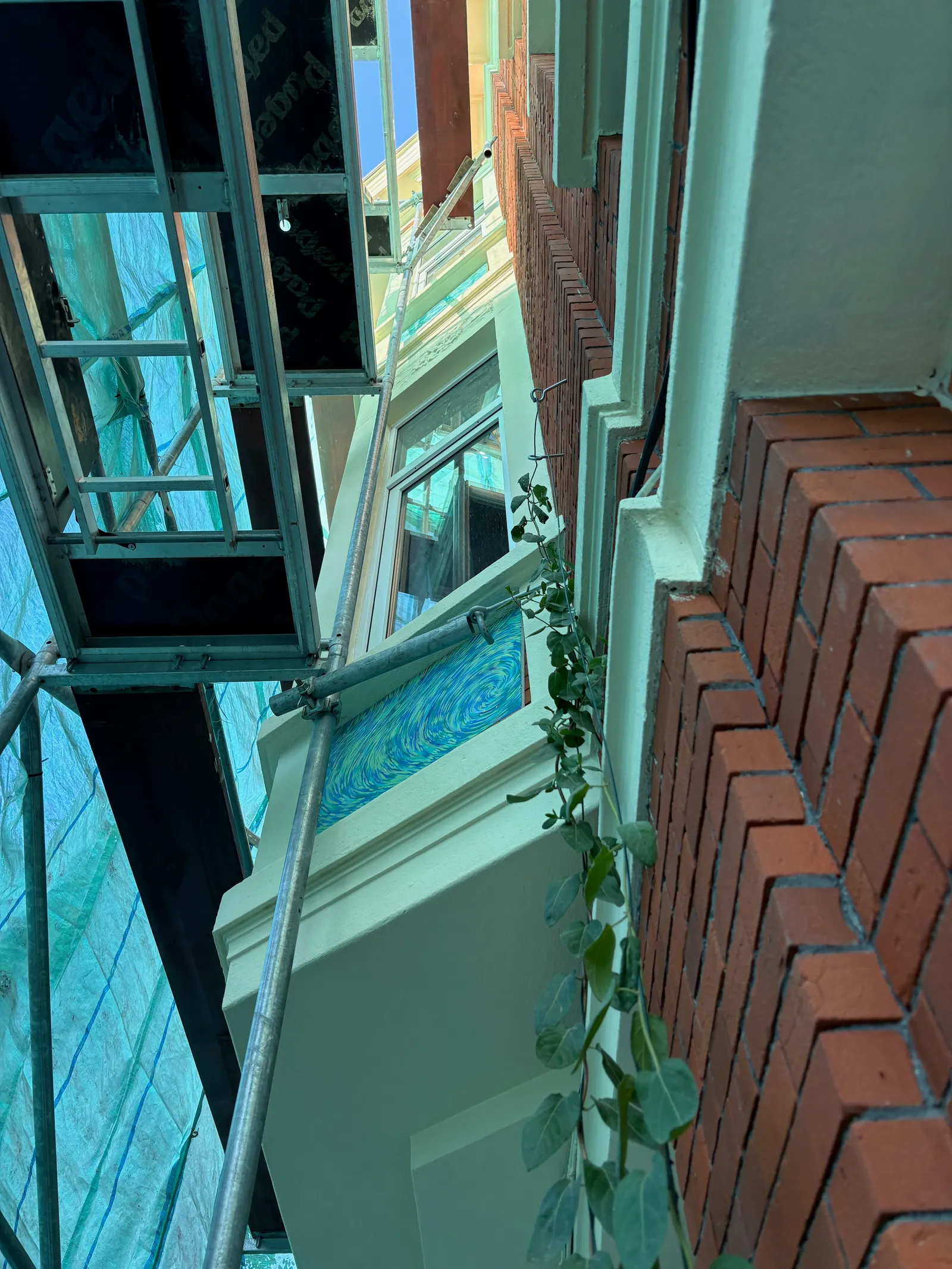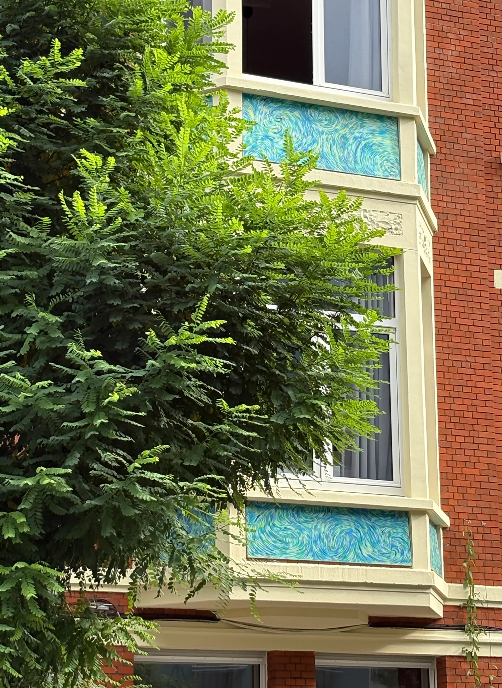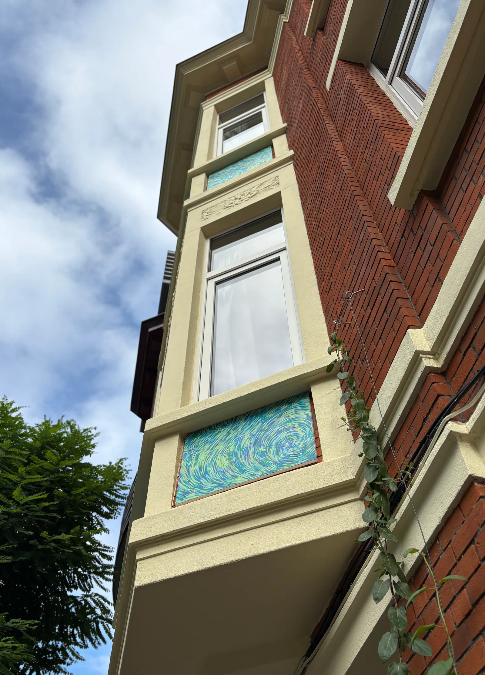 Het huis van Alex, ondergedompeld in krullende lijnen, organische vormen, de lievelingskleuren van Ray. Een ‘tableau’ - zoals je er meer vindt op gevels in en rond de Tentoonstellingslaan - maar dan van 100 of meer jaren later.