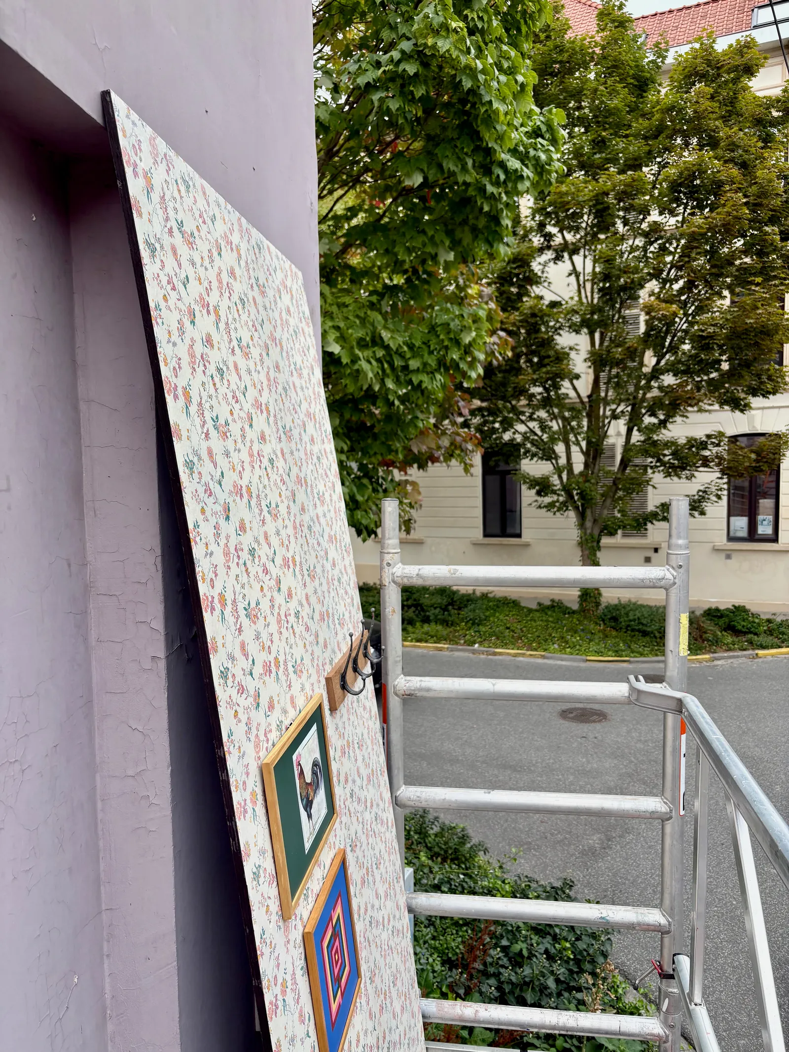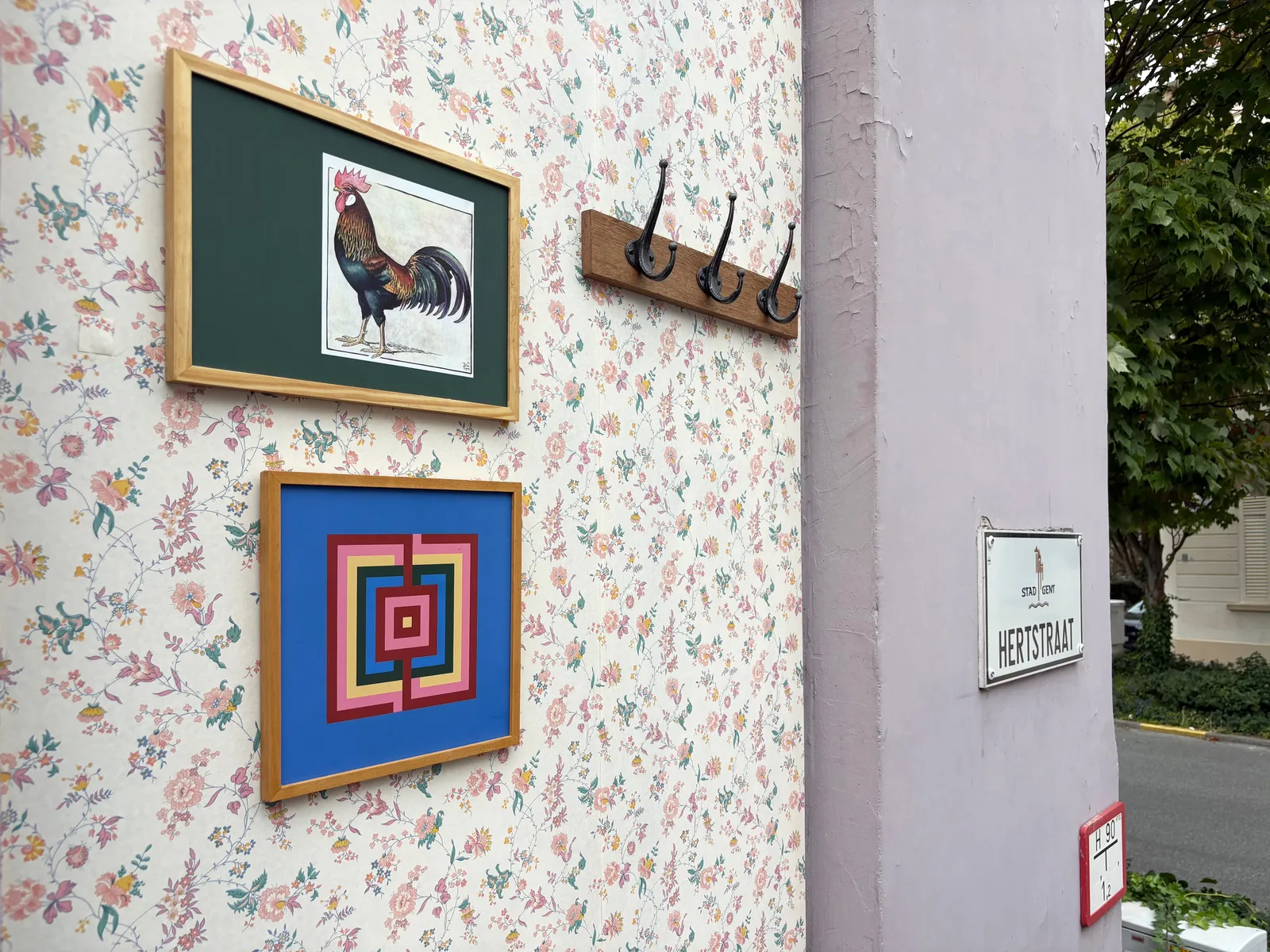 Bloemetjesbehang van bij Priem en een kapstok op reikhoogte. Een aquarel (© René Delin 1924) van een haan: elke dag wakker worden en er met zijn allen het beste van maken, een metafoor voor ons collectief verlangen naar een goed leven.